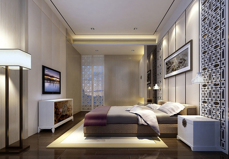 墙壁上简易的中式挂画和色彩稍作点缀,